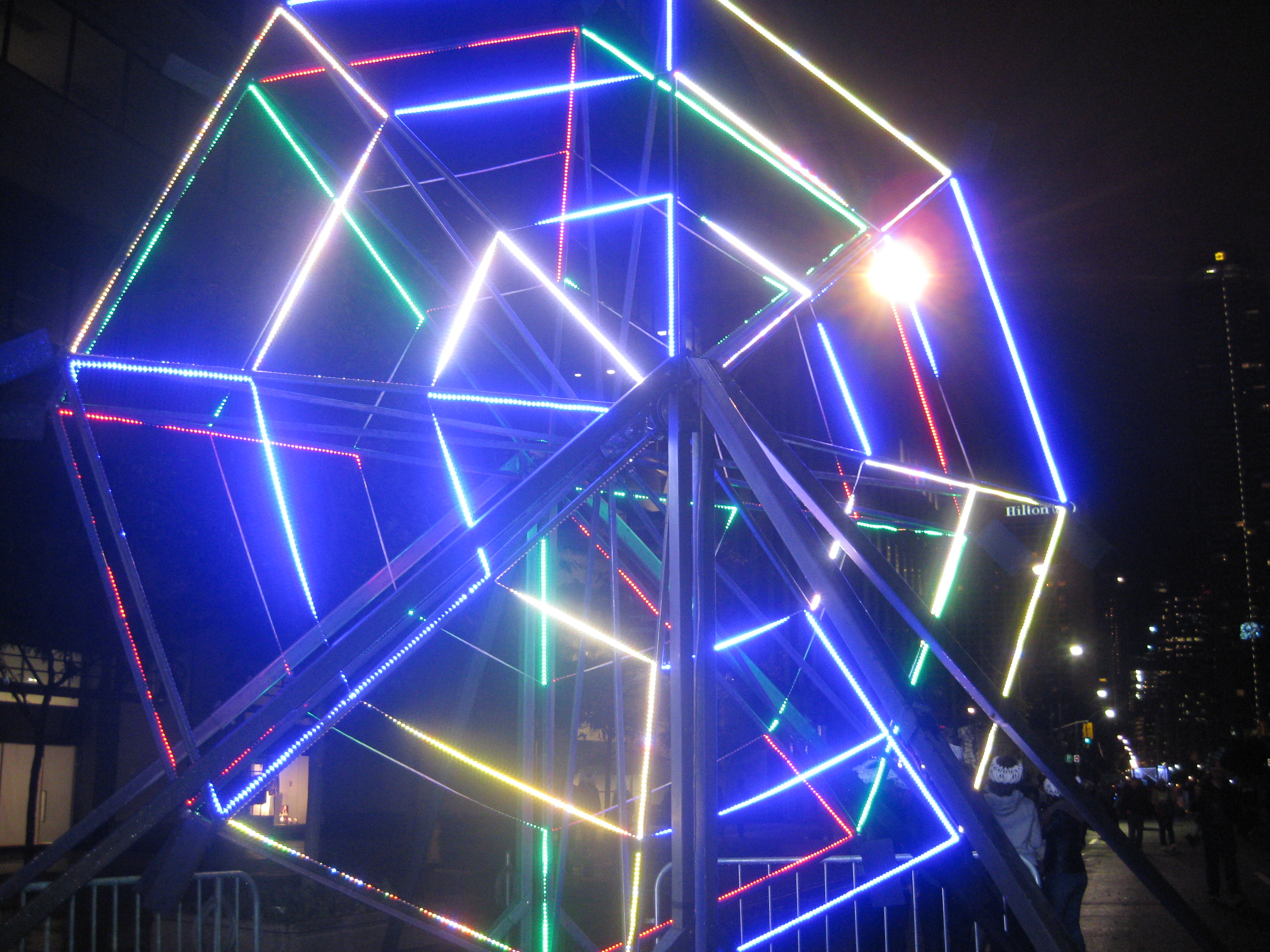 Scotiabank Nuit Blanche is when the city of Toronto turns into a sleepless night of art in the streets. The artists take over a good chunk of the city with their art work for you to see. It started at 6:51 pm October 5th and finishes off October 6th at sunrise, the streets were absolutely crazy at 11 pm when I headed out with my sister due to your Toronto Maple Leafs beating Ottawa 5-4! As we exited the Fairmont Royal York hotel Leaf fans high fived us and cheered for their win, you could hear hundreds of fans cheering in the square, where you could watch the game outside on the big screen.