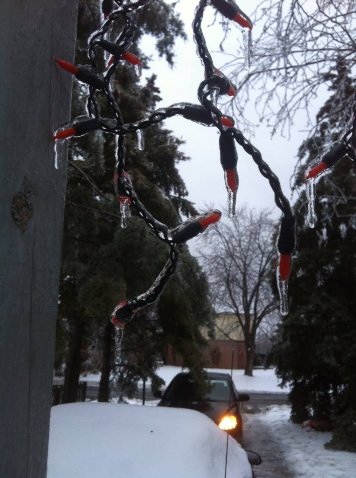 I don’t know if you guys know this but I live in Toronto, Ont, Canada. If you’ve looked at the weather for us it has been typical winter weather but all of the sudden it decided to half snow and half rain – making it ice pretty much. It rains all day long but as soon as it starts to turn into night the ground freezes making it one big sheet of ice. I went to sushi last night with my friends, when we were done we had to skate our way to the car. It was actually so funny because the driveway is on a hill but at the same time it was very dangerous. I hope when I go to work tonight and walking to my boyfriend’s car I don’t fall on my ass. I don’t have a picture for you guys from myself but I am going to steal one off of Facebook from a friend.