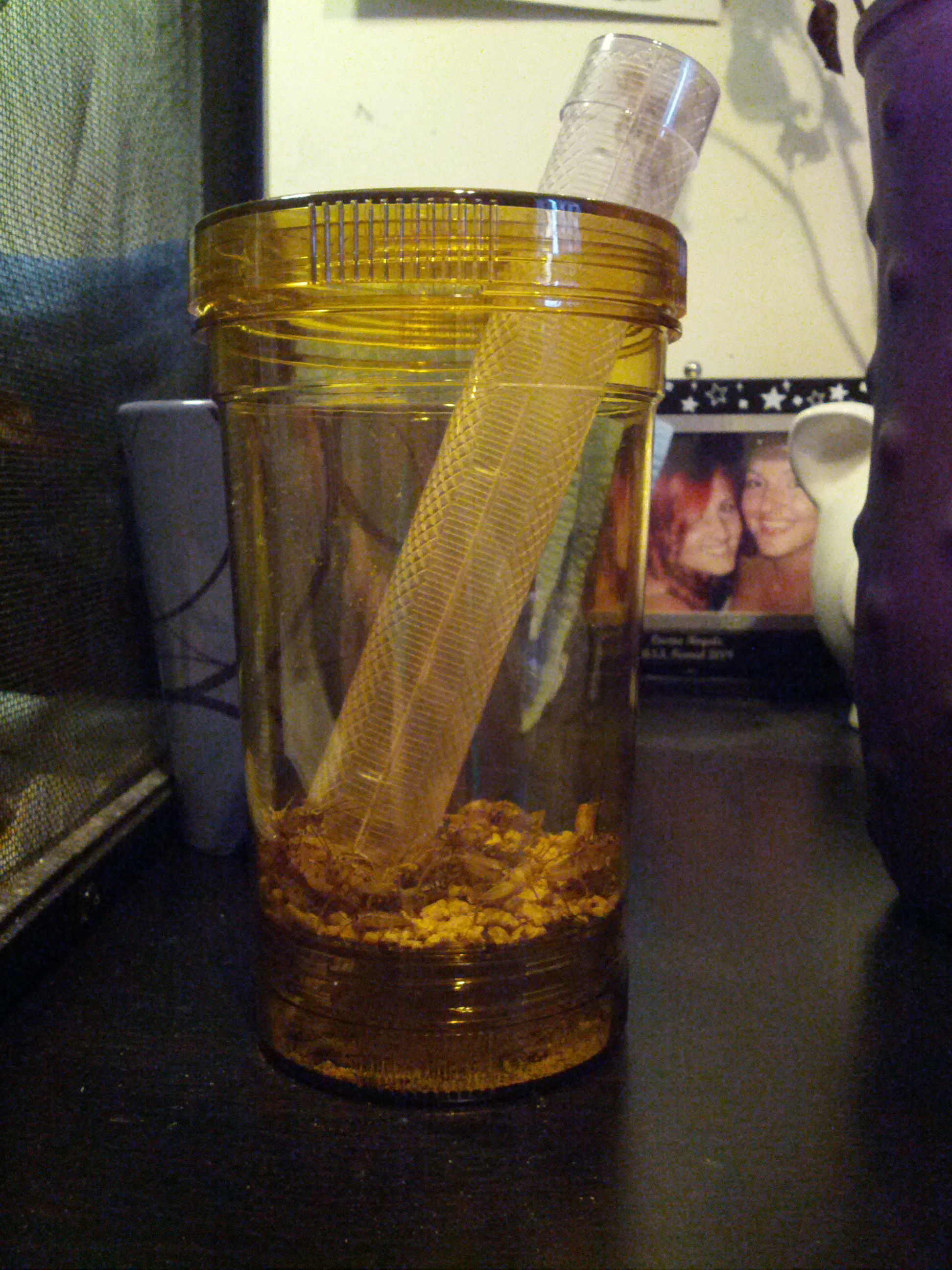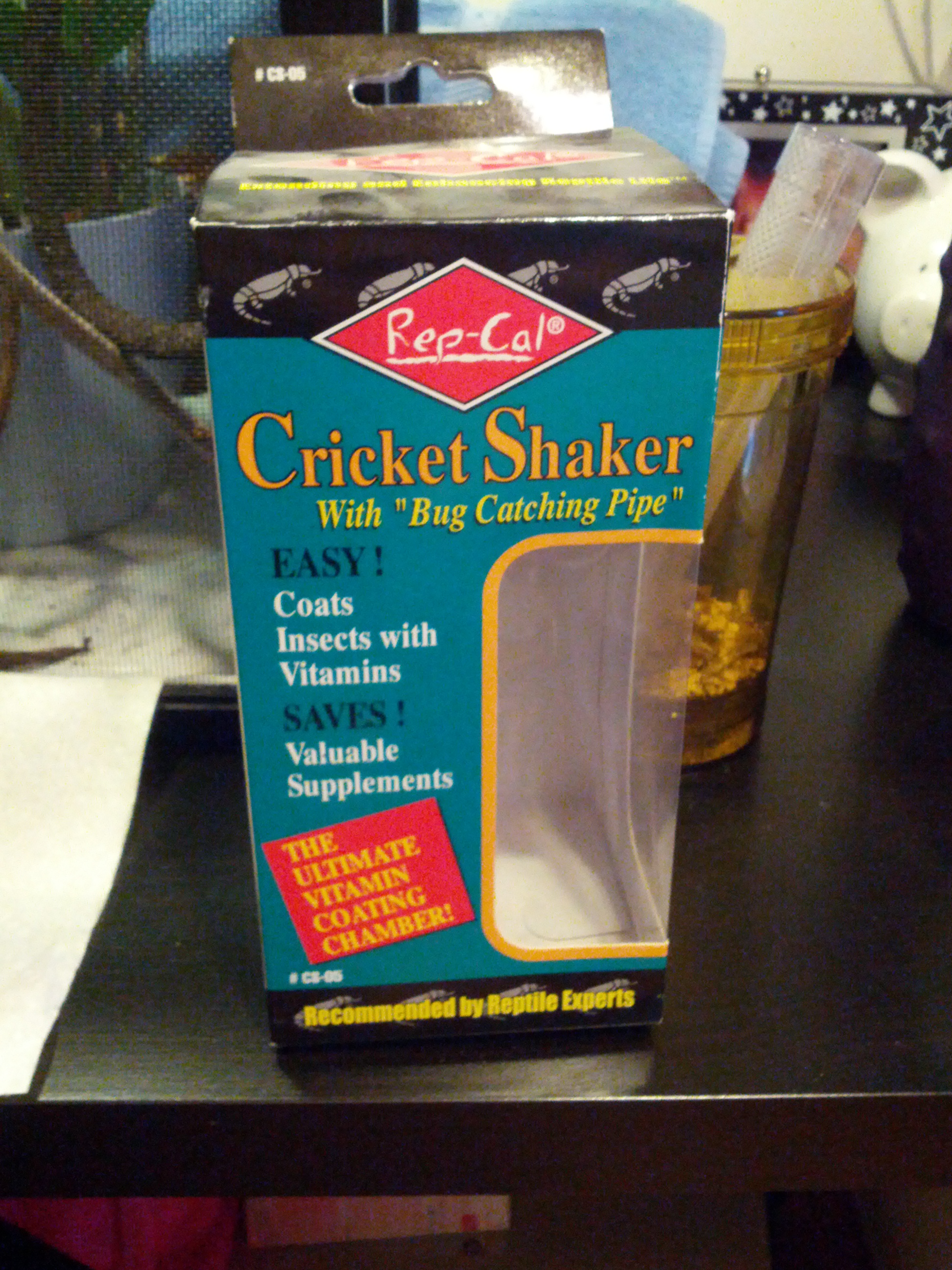Cricket Shaker: My boyfriend normally just picks up the bugs, puts them in a container, shakes the powder on them and feeds the guy but I hate bugs so I’m obviously not going to do that. My boyfriend was nice enough to buy me this thing called a Cricket Shaker. It’s pretty cool, you’re suppose to put the powder in there but he forgot it. You put the crickets in the container, and it comes with this pipe that they climb up and when it’s time to feed you can put the crickets into the cage or into a container and let him eat them out of there. That way you know for sure how much he eats. This thing was so dusty and he told the cashier that I was watching it and I’m such a girl for hating bugs. It’s true, bugs are not my thing at all so I’m glad I have this.