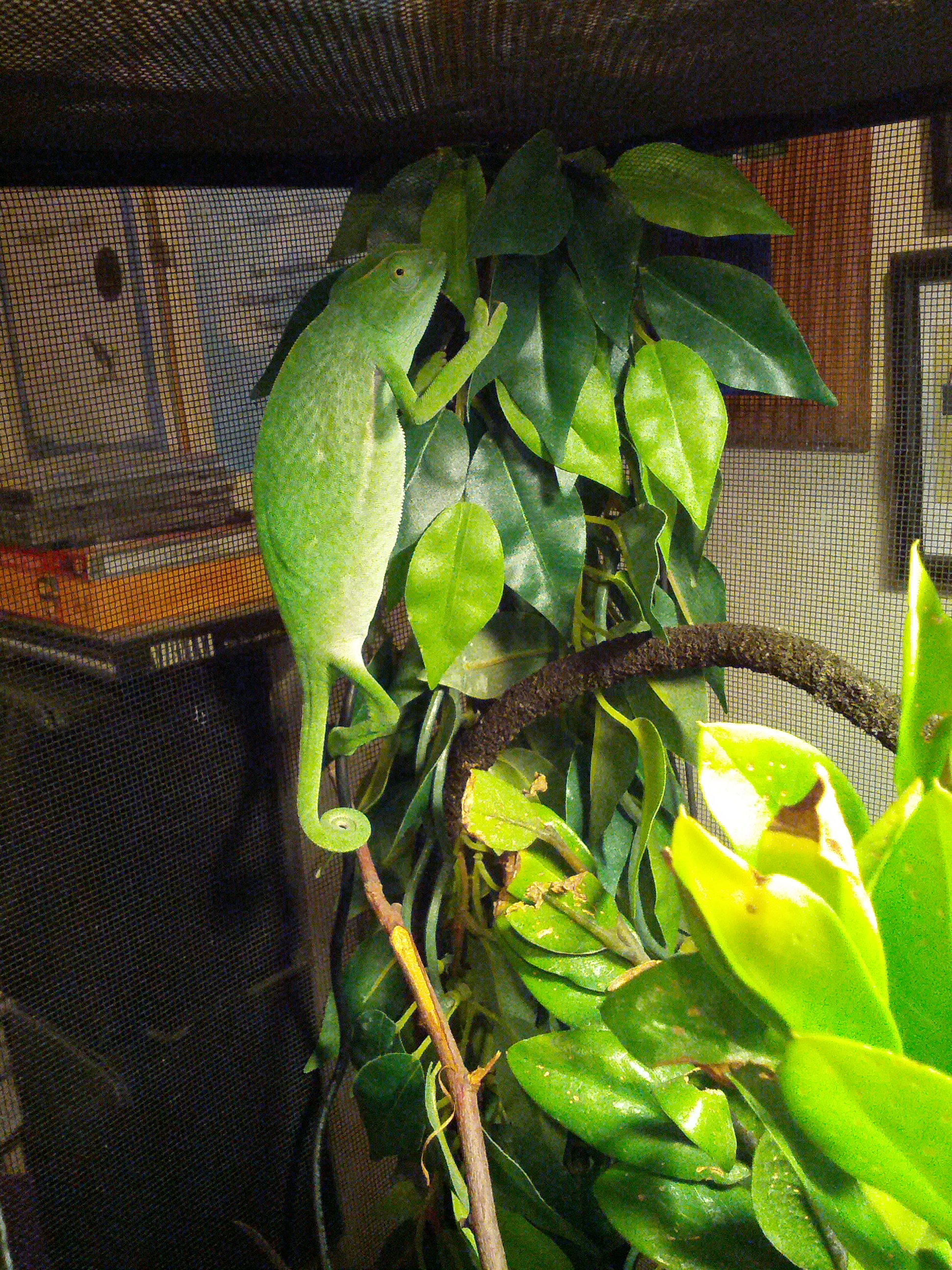 The Tank: We call it a tank because we are so use to calling the other animals tank but it’s more like a cage I guess you can say, tank also sounds a lot better. I don’t know the size of the tank but it takes up my whole desk and my mum was shocked how big it was for such a little guy. We have a real plant in there that he hides in sometimes, real and fake branches all around so he can climb on or just hang out, we have a fake plant in the top left back corner which he loves a lot and usually sleeps and finally we have a dripper in the front left corner that he isn’t sure about. The tank itself is screen so he can climb all around on that; switch he loves to do – we call it Allen’s Adventures. The most important thing that is apart of the thank that you see if the light that is on top. That is what keeps him warm, and gives him a sense of night and day. We have it set to a timer so we don’t have to worry about not being home to turn it off or on.