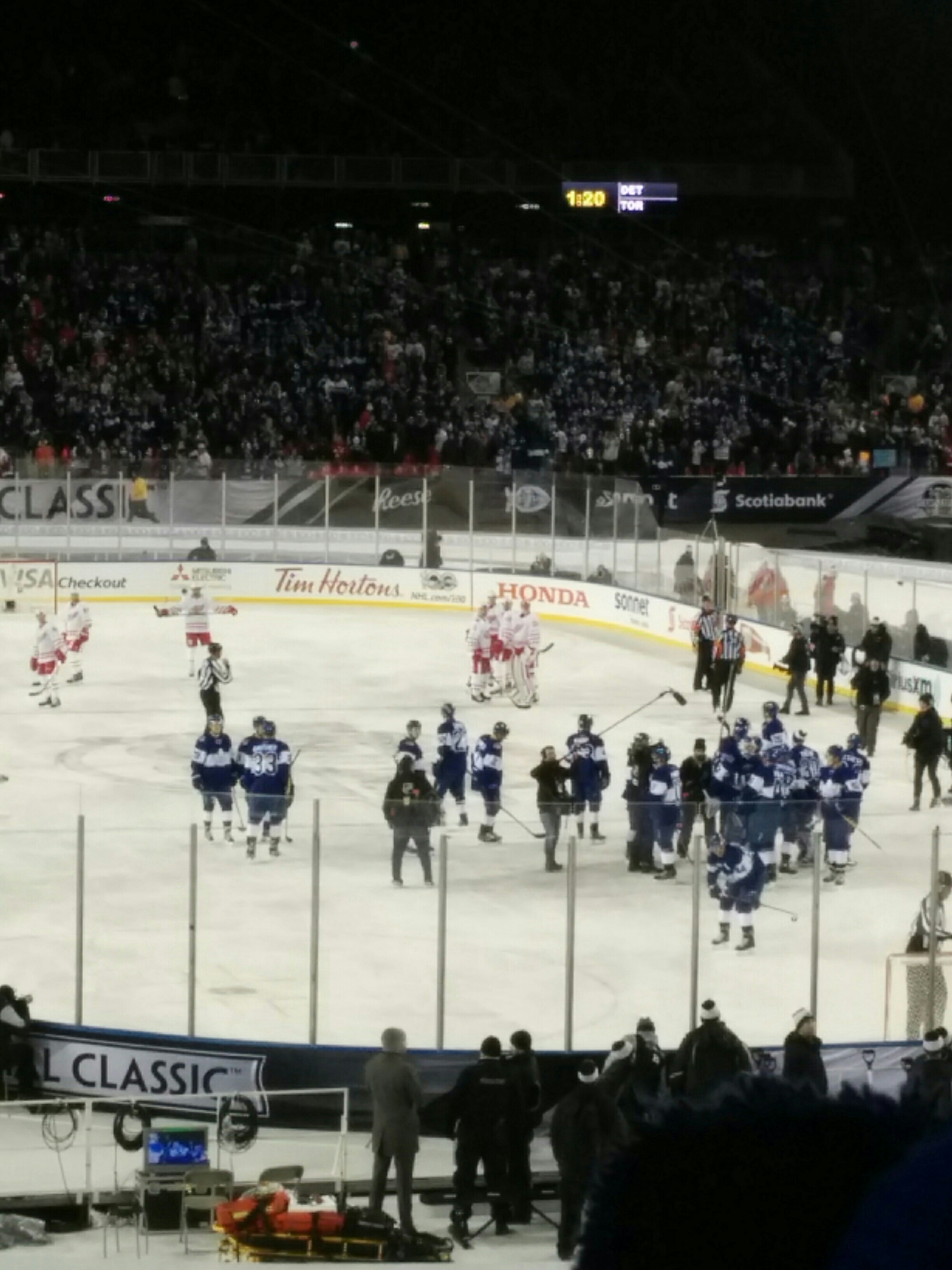 In the third the leafs took the lead until literally the last second of the game when the Red Wings scored. It went under review since everyone said the clock ran out. The goal was good and into overtime we went. It was intense, not a single soul was sitting down then Austin Matthews scores! I kid you not the bleachers were bending from people jumping up and down, everyone was yelling and high fives were all around. In that last 5 mins we all forgot we were freezing our butts off.